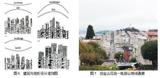 在中观层面,旧金山城市设计制定了著名的山型碗型设计导则(图6)。即地形越高的地方,建筑也应该越高,地形越低洼的地方,建筑也应相应降低,从而让人们能够清晰感受到自然地形的起伏,构成了旧金山最具特色的景观视廊和街道,例如最著名的如花街(Lombard Street)—电报山(Telegraph Hill)视廊(图7)等。