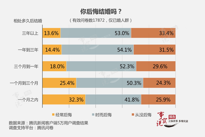 同时,结婚越快,婚后后悔的几率也就越大。认识一个月之内就结婚的人中,三成经常后悔,远远高出了其他人。