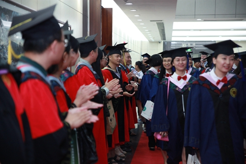 谭文长宣布毕业典礼正式开始,全体与会人员起立奏唱国歌。随后,毕业生代表、教师代表、校友代表、校领导代表依次上台发言,全体师生共同见证了这一庄严而又神圣的时刻。