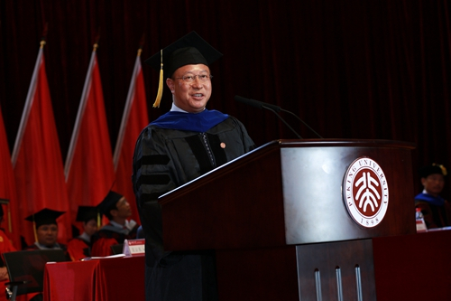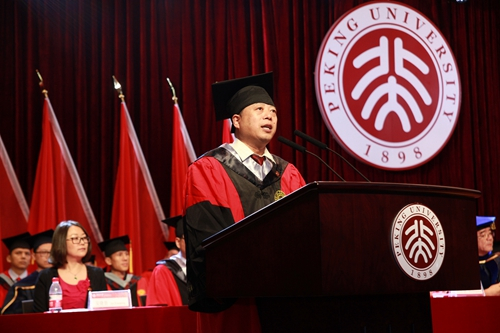 吴云东在发言中为毕业生奉上一个“爱”字。他强调,爱是需要用心的,爱是生命永恒的话题,更是对美好生命的无限赞誉。教育是价值观的传递,更是爱的传承。学习科学、利用科学是对自然万物的爱;学习文化艺术是对人类文明和美好生活的热爱。同时,爱也是一种平衡的艺术,平衡更需要建立在爱的基础之上,天人合一是人与自然的平衡,和谐社会是人与人的平衡。但是爱没有统一的标准,爱是兼容并包的,这与北大精神不谋而合。最后,吴云东赋诗一首,并以“爱在心头解万忧”为结尾寄语毕业生:相信爱的力量,对亲人、家庭、事业以及自然万物保持诚挚的爱。
