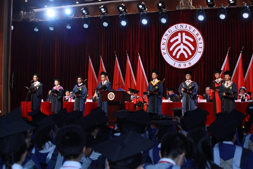 毕业典礼正式开始之前,现场播放了专题毕业视频《当我们一起走过南燕》,这支毕业MV由学生作词、各院毕业生参与录制与拍摄。镜头掠过五四塔、镜湖、校友林、丽水路、彩虹桥,在“梦,在南燕聚首,大步向前走,对北大爱的坚守”的旋律中,带领大家回顾了毕业生在南燕生活、学术的点滴,这既是他们在南国燕园这片热土上拼搏和奋斗的见证,更是他们心中对南国燕园最美好而温馨的回忆。随后,全体毕业生在胸前佩戴北大校徽并合唱《燕园情》来表达对北大精神的传承和对母校的眷恋与祝福。