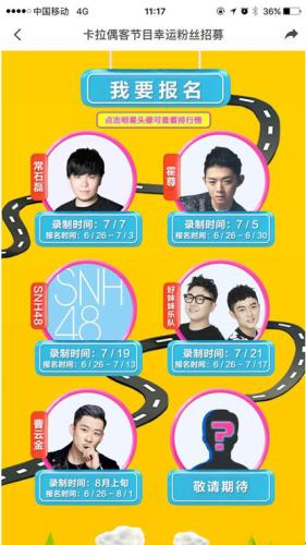 与传统综艺点播形式不同,《卡拉偶客》直播版与花椒直播达成深度合作,将对节目录制进行独家直播,并与花椒合力打造“互动大作战”、“微型演唱会”两大互动环节。在花椒直播过程中,网友可以通过弹幕对明星唱功、弱点等进行槽评,与明星展开实时互动。同时选拔幸运粉丝上车与明星同车互动。据悉,《卡拉偶客》幸运粉丝招募活动已在花椒平台上线,网友可录制视频参与打榜,获专属礼物多的网友将有机会获得与明星“零距离”互动机会。