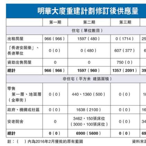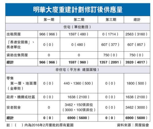 明华大厦原本分三期进行,新修订是将第二期原本拆卸的H、I、J共三座,改为拆卸F、G、H、I、J共五座,扩大地盘面积后,可兴建三座新公屋,提供2563个单位,虽较原计划3160处减少两成,但足够原区安置明华大厦所有住户。按香港房协现时统计,原区安置涉及需要2273个单位,意味有290个单位可供编配轮候公屋人士等用途。
