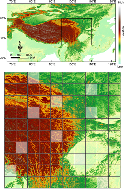 图2. 研究区域划分成10×10的棋盘格,白色栅格为随机的采样空间