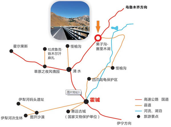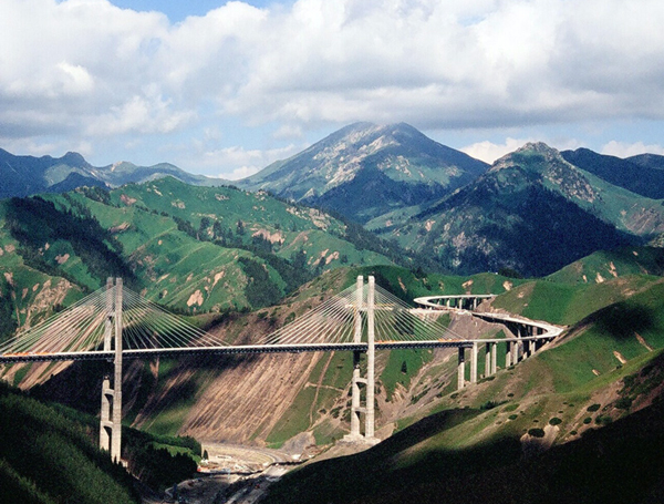 果子沟大桥作为新疆第一座斜拉桥、第一高桥,是新疆最大最重要的桥梁,同时也是全国首座公路钢桁梁斜拉桥,它集新技术、新结构、新工艺、新设备“四新”于一身,是新疆公路建设史上一次重大突破。桥身与果子沟美景浑然一体。