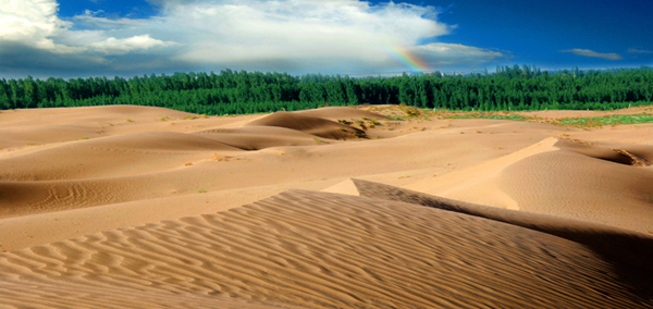 图开沙漠是一个以固定、半固定沙丘为主体,局部流动的年轻沙漠。它集大漠风光和天山秀色为一体,沙漠神奇浩瀚,金涛耀眼,热浪翻滚,而身旁的伊犁河依然悠悠流淌,河畔林木青翠,雪山、蓝天、绿野、黄沙构成了伊犁地区最富特色的沙漠风景区。