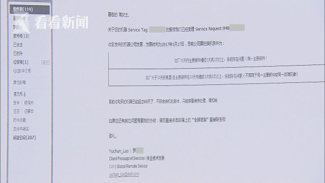 蒋女士认为,自己前后报修了六次,换了许多配件还不解决问题,按理应该换一台新机器。但戴尔发来邮件表示,公司抬头的发票,换机条件是出厂60天内同一主要部件维修2次或以上,所以蒋女士的情况并不符合条件。蒋女士再一看发票,戴尔现在主体在厦门,线上说不清,难道要让消费者跑到厦门去交涉吗?