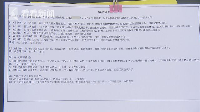 蒋女士说,她的戴尔电脑是今年1月17日以公司的名义在戴尔线上购买的。才用了没多久,电脑就出现使用中突然黑屏的情况。2月中旬,她拨打戴尔400电话报修后,对方远程指导其互换显示屏连接线,但故障并没有排除。3月份,戴尔为蒋女士更换了显示器,可4月5日,电脑又突然黑屏了。 蒋女士4月下旬报修,戴尔方面给她换显示器、主板、数据线,当时以为应该没有问题了,结果到5月上旬的时候,同样的问题又发生了。