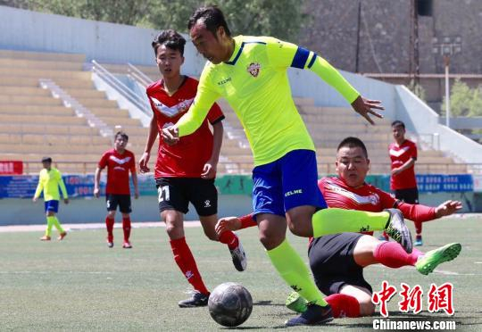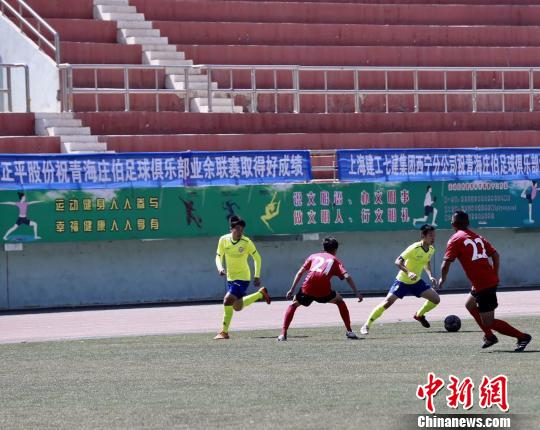 图为青海庄伯足球队(荧光黄队服)与红花队展开较量 胡贵龙 摄