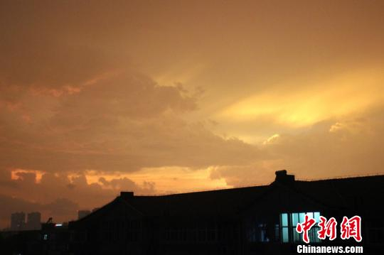 中新网记者目击到,当暴雨持续至19时40分左右时,该市北侧天空突然出现大面积昏黄的亮光,犹如白天黄沙避日的沙尘暴景象。该景象出现时,曾伴随有巨大的炸雷和闪电,其境令人悚然,景象持续到19时56分时慢慢消退,至20时许,天空完全恢复夜幕状态。此时,已是万家灯火,狂风暴雨也暂告停歇,偶有远处轻微的雷声及微弱的闪电划过。