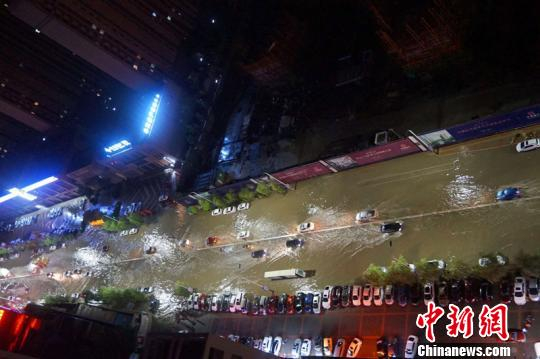 狂风暴雨下,汽车在街道积水中艰难前行。 李岩 摄