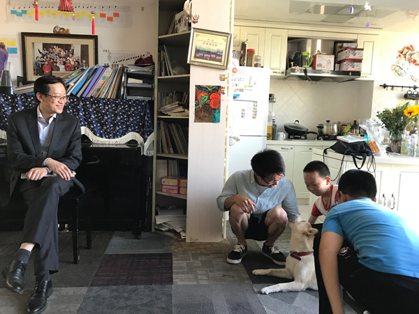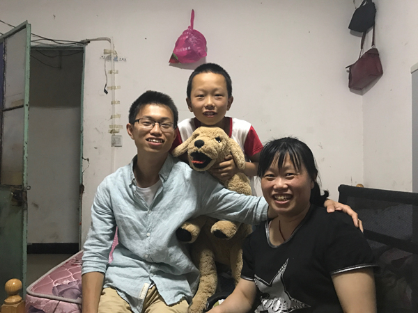 屠文建(左一)和妈妈弟弟在出租房里。 澎湃新闻记者 张维 图