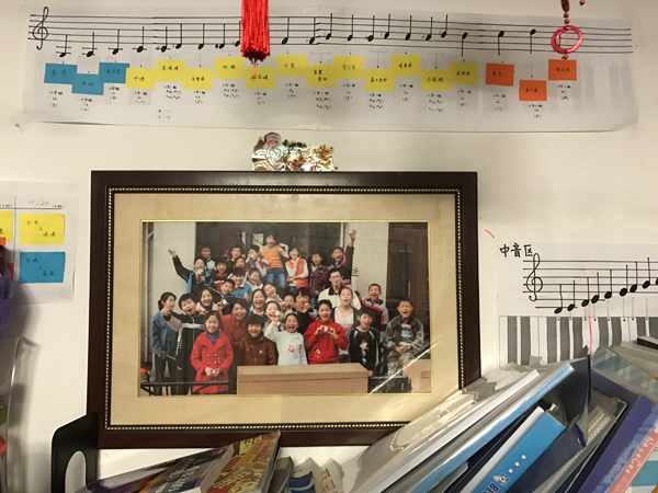久牵浦西活动中心,钢琴上放着十年前“放牛班的孩子”合照。 澎湃新闻记者 张维 图