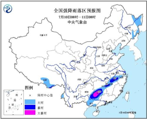 全国强降雨落区预报图(7月10日08时-11日08时)