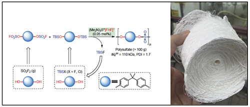与聚碳酸酯和聚酯类材料相比,相应的聚硫酸酯和聚磺酸酯类材料具有更高的化学稳定性(Sulfate Vs Carbonate,Sulfonate Vs Ester)和优异的力学性能,其特殊的韧性和抗冲击性使得这类新型热塑性材料很有可能在汽车制造、航空航天、电子设备、建筑和包装材料等领域取得应用。但是,由于传统合成方法和工艺的限制,无法大量获得此类聚合物,因此,到目前为止,聚硫酸酯和聚磺酸酯类材料仍然未能实现规模化生产和商业应用。