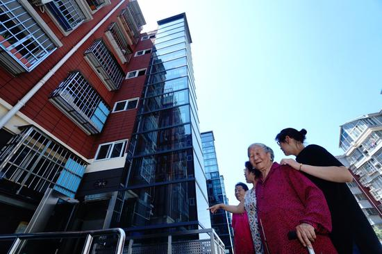 改造工程采取了先试点后推广的方案,先加装1部电梯让群众体验,村民满意后在全小区推广。项目实施中,采纳群众建议,注重细节,不断优化改进设计方案。比如,一些老年人晕高,就放弃原有观光梯设计,采用封闭式轿厢梯;为方便轮椅进出,增宽电梯门。