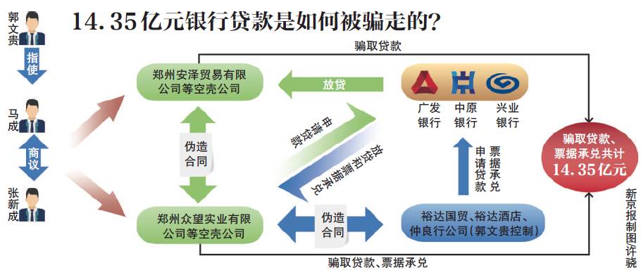公诉机关称,马成遂与时任裕达置业财务部经理、财务总监的被告人张新成商议,以“空壳公司”和郭文贵实际控制的郑州裕达国贸酒店有限公司、郑州裕达国际贸易有限公司、郑州仲良行物业管理有限公司等的名义,通过伪造多份销售合同或装修合同、虚构投资项目等方式,从2008年5月至2015年4月,40多次从7个银行骗取贷款和票据承兑,共计人民币14.35亿元。