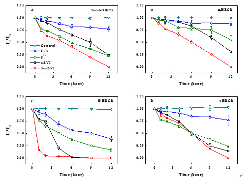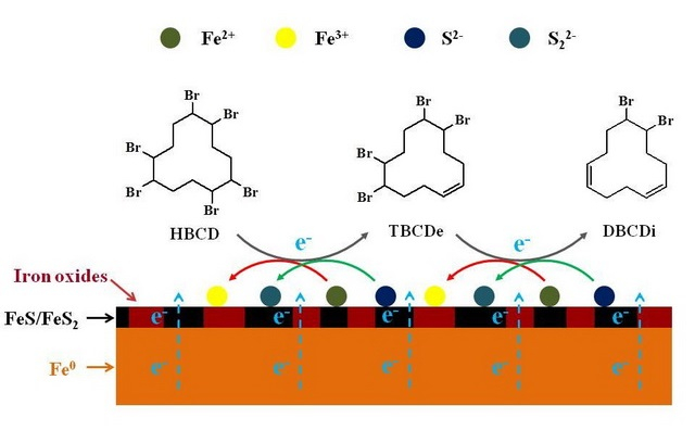 纳米硫化零价铁是一种硫化物包裹零价铁的新型纳米复合材料,具有强还原性和水稳定性,已被报道可以有效去除重金属、放射性元素以及氯代有机溶剂等多种污染物。然而,关于纳米硫化零价铁是否能还原转化各种POPs(如HBCD)并不清楚。近期,中国科学院广州地球化学研究所博士研究生李丹在导师彭平安和钟音的指导下,深入研究了纳米硫化零价铁对HBCD的还原转化效率和机制。研究系统比较了纳米硫化零价铁和三种典型还原剂(即纳米零价铁、硫化亚铁、硫离子)还原转化HBCD的动力学及转化途径。结果显示,纳米硫化零价铁对HBCD及其三种同分异构体的还原去除速率显著高于三种典型还原剂(图1)。特别地,α-HBCD的结构对称、稳定性强、难降解,容易在环境和生物样品中富集,但纳米硫化零价铁对α-HBCD的转化速率是其它三种还原剂转化α-HBCD的速率的2-15倍。HBCD在纳米硫化零价铁作用下能发生双溴消除反应(图2),逐步转化成为四溴环十二烷碳一烯(TBCDe)和二溴环十二碳二烯(DBCDi)。通过对反应前后纳米硫化零价铁固体表面特征分析,揭示了纳米硫化零价铁表面的FeS不仅能作为催化剂加快反应速率,还能直接参与HBCD的还原转化,进一步促进HBCD的去除。研究还系统分析了各种环境因子对纳米硫化零价铁还原转化HBCD的影响。研究结果为将纳米硫化零价铁应用于受HBCD等POPs污染的厌氧环境的实际修复奠定了理论基础。