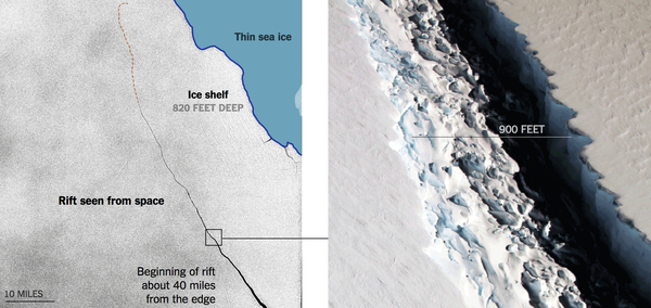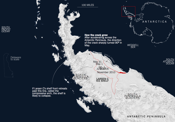 一道长约120英里的裂隙在过去几年中逐渐形成,直至冰山断裂。