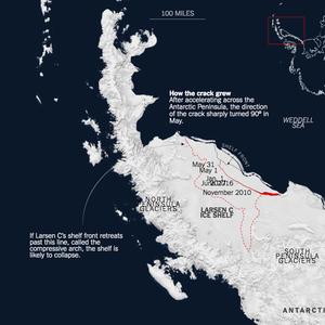 拉森A冰架已从1995年开始在几年的时间里崩解了。拉森B冰架在2002年发生了突然的崩溃。现在,科学家们担心,巨大冰山的脱落可能是拉森C冰架崩解的第一个阶段。