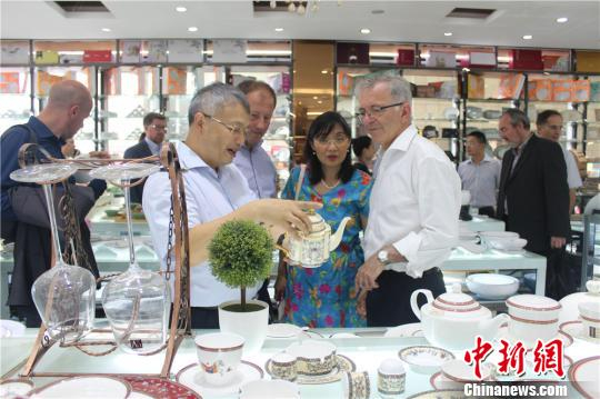 7月13日,法国中央-卢瓦尔河谷大区议会主席弗朗索瓦?博诺考察湖南高桥大市场瓷器用品店。 刘着之 摄