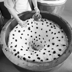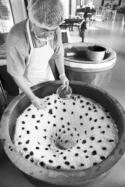 7月11日,南通“花露烧”酒酿制技艺传承基地——穆义丰酒坊的酿酒师下酒曲后“开酒窝”,使其更均匀的全面发酵。