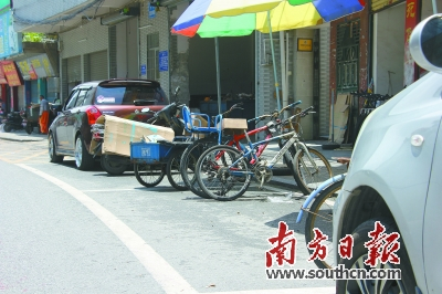| 商铺“霸占”公共停车位现象时常出现,图为环城中路某商铺用废旧自行车等圈占车位。 受访者供图 |