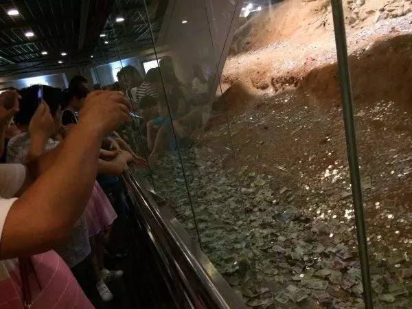 有些没扔好,硬币撞到了玻璃上,发出叮叮当当的声响。有的小孩子追着掉在地上滚动的硬币满展厅跑,场面多少有些混乱。