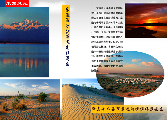 米东区拥有非常丰富独特的旅游资源,集高山、绿洲、沙漠三大自然景观于一体。