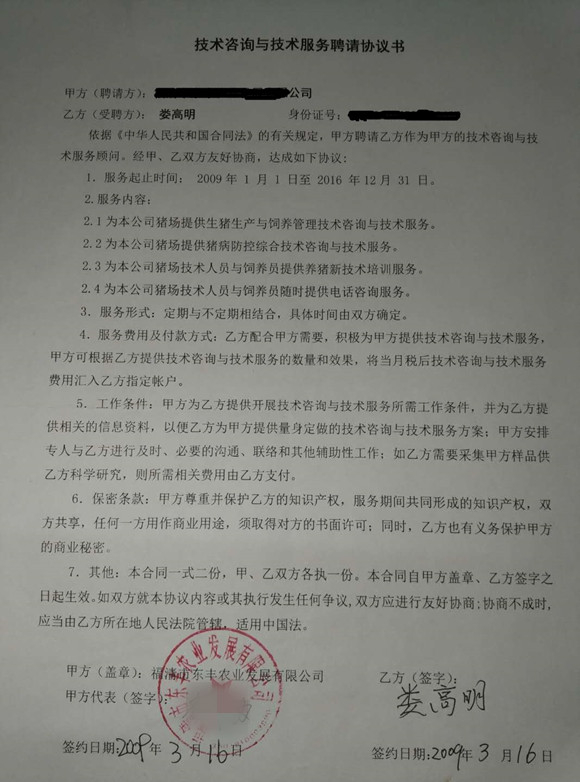 界面新闻记者获得一份施某和娄高明的《技术咨询与技术服务聘请协议书》显示,娄高明提供的服务内容包括为猪场提供生猪生产与饲养管理技术咨询与技术服务、猪病防治综合技术咨询与技术服务,为猪场技术人员与饲养员提供养猪新技术培训服务、电话咨询服务等,协议书中的乙方签字显示为:娄高明。