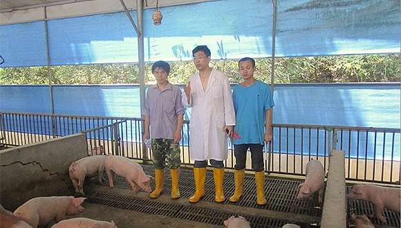 娄高明(中)在猪场诊断猪病。