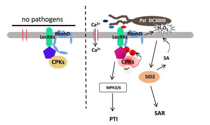 中国科学院微生物研究所刘俊课题组一直致力于研究拟南芥受体类激酶在植物先天免疫中的作用。该课题组在研究中发现一类凝集素受体类激酶(LecRKs,lectin receptor like kinases)在对PTI的响应过程中起了重要作用。PAMPs的处理可以诱导LecRKs的表达,激活的LecRKs可以招募钙离子依赖的激酶(CPKs)去磷酸化细胞质膜NADPH氧化酶D(RbohD),进而激活植物内的过氧化氢-水杨酸回路,激起植物的免疫应答反应(如图)。这也是拟南芥中首次报道的可以将PTI和水杨酸信号通路联系起来的信号组分。