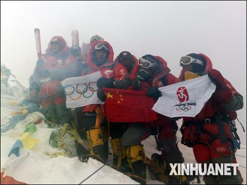 资料图:2008年5月8日,北京奥运圣火珠峰传递登山队成功登顶珠峰。这是登山队员在峰顶展示“祥云”火炬、火种灯、中国国旗、奥运五环旗和北京奥运会会徽旗。新华社特约记者 阿旺扎西 摄