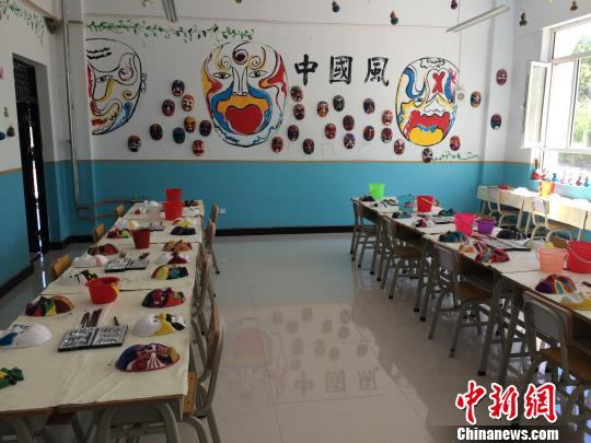 在喀什地区伽师县双语小学,少数民族学生制作戏剧面谱。 蔡敏婕 摄