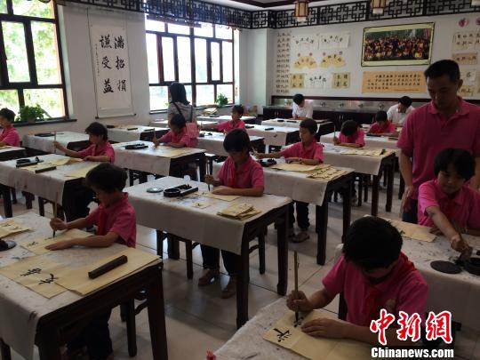 在新疆喀什地区疏附县托克扎克镇中心小学,维族学生们在练习写汉字书法。 蔡敏婕 摄