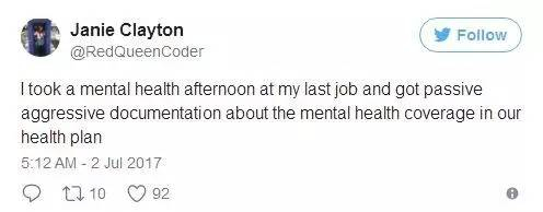 但最近,一个20多岁的美女程序员就以“精神健康不佳”为由理直气壮地请了病假。令人羡慕的是,她的老板不仅大方准假,更是发信感谢她勇敢地打破禁忌,公开谈论职场人士精神健康(mental health)的问题。