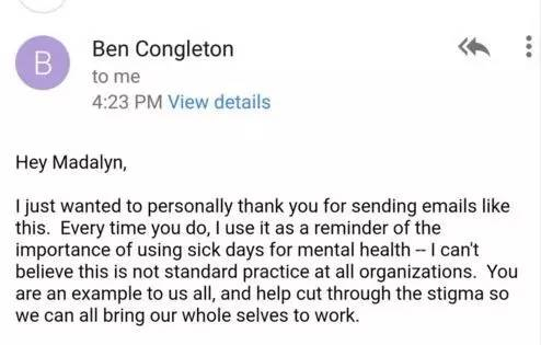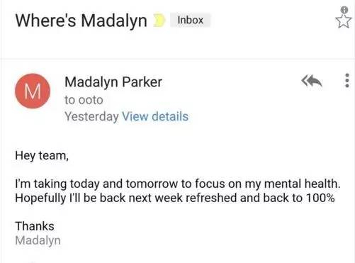 这个名叫玛德琳·帕克(Madalyn Parker)的美国妹子将自己和老板的邮件在推特账号上公之于众,很快引来了全世界网友的疯狂点赞,并且美国主流媒体也跟进报道,关注起了精神健康这个话题。