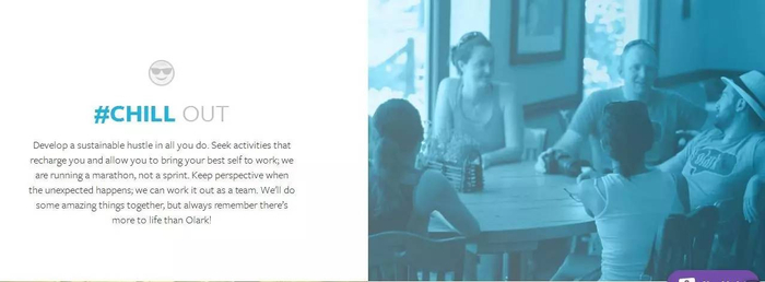 每经小编(微信号:nbdnews)在Olark公司官网发现,该公司将轻松友好的工作环境(Chill out)列为公司核心价值观的第一位。