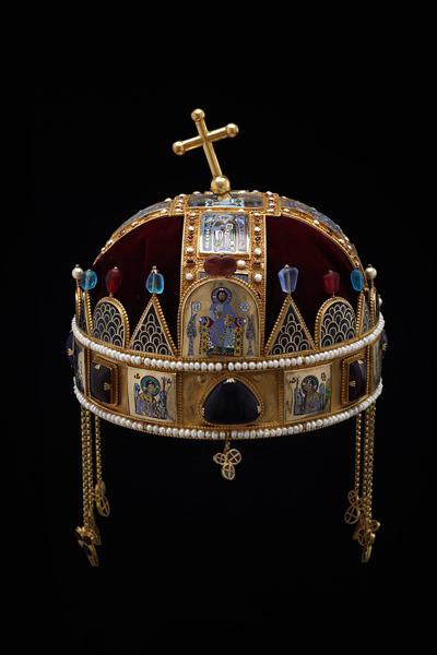 第一次把这顶圣冠带在头顶的国王是斯蒂芬一世(Stephen I,975—1038,他在位期间,强制推行天主教信仰。在公元1000或者1001年,教皇为他加冕,匈牙利因此升格为王国)。因此,圣冠也被称为圣斯蒂芬王冠(Crown of Saint Stephen),它第一次被称为圣冠是在1256年。王冠呈椭圆形(宽20.39厘米,长21.59厘米),因为其直径大于普通人的头的宽度,因此,在加冕期间,国王不都得不在王冠内放一个半球状的皮革衬里。如果国王在加冕仪式上不戴圣冠,其合法性就无法得到承认。王冠的重量是4磅8.52盎司,约为2056克。王冠的上下两部分合金比例不同,也不对称。最初的圣冠并没有保存下来,现存的圣冠是后世重新制作的,由匈牙利国会议事堂永久保存,此次上海博物馆展出的是圣冠的复制品。