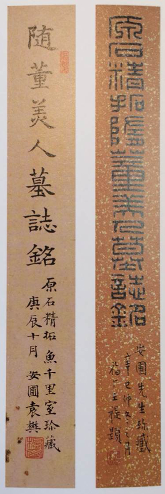 《隋董美人墓志》原石,于清嘉庆道光间出土于陕西兴平县,先后归上海陆剑安、徐渭仁所藏,徐深为珍爱,因此名其斋为“隋轩”,咸丰三年(1853)毁于兵燹,存世只有二十多年,故原石拓本甚少,为世人所珍,翻刻本较多。吴湖帆所藏原拓,即徐渭仁的原藏。袁安圃在题跋中对所藏本赞曰:“此本开卷即觉光华外发,风姿婀娜,字体稍瘦,而极墨不溢笔、笔不滞墨之妙”,但他又不无感叹,说:“其存世之暂,又与美人之红颜摧谢同,其可伤嗟呼。美人不永,庸讵知千百年后,其志石之所遭,竟亦如昙花一现邪。”袁氏谓其旧藏为庞氏味道腴斋蝉翼淡墨拓景印本,字体丰腴,及见吴湖帆藏本,则字体较瘦,以后的翻刻本“结体疏滞,神采不完”,且“墓字土旁无点,制字完整无蚀,是为翻刻伪本之左证”。又说:“彼拟玉环之丰,此方飞燕之弱,亦如定武兰亭之肥瘦平睨传为嘉话欤?”看来,袁安圃对《隋董美人墓志》是作了一番校勘研究的。