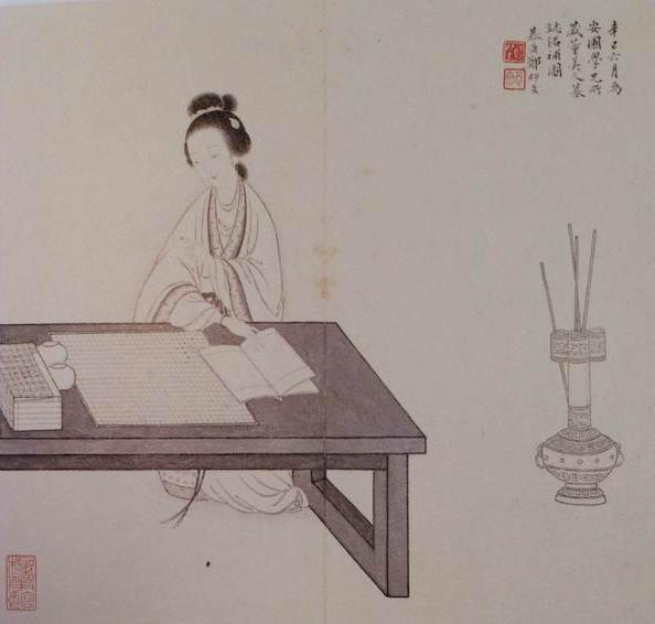 郑慕康画《美人读谱图》,并题曰“辛巳六月为安圃学兄所藏董美人墓志铭补图”
