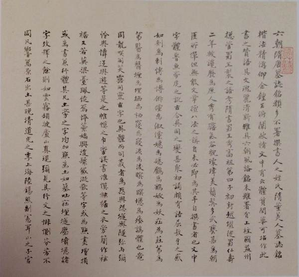 《隋董美人墓志》是蜀王杨秀为其侍女董美人写的墓志,铭文中写董美人之丰姿有云:“态转回眸之艳,香飘曳裾之风,飒洒逶迤,吹花回雪。”写其墓地云“依依泉路,萧萧白杨,坟孤山静,松疏月凉。”瑰丽清新,雅具六朝文风。墓志铭的书体楷法精备,有着上接魏晋下启李唐的微妙转变,多为收藏家所追求,海上收藏家吴湖帆,花十年之工,兹兹寻找,他写道: