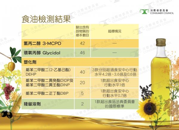 7月17日,香港消委会发布消息称,在大规模测试60款市面较常见的食油样本中,发现41款含塑化剂,当中5款更高于香港行动水平和欧盟标准的上限,2款检出残留溶剂三氯甲烷(Chloroform,俗称哥罗芳)。