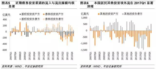 从其他投资项来看,内资外流从2016Q2取代外资外撤,成为其他投资项净流出的主要动力。然而,内资外流在2017Q1显著放缓,这很可能是央行显著收紧了资本外流管制的结果(图6)。