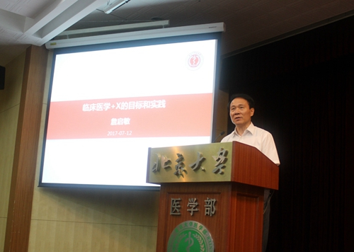 詹启敏在报告中介绍了“临床医学+X”的目标、定位、建设思路、建设原则、建设内容和最新的工作进展。他指出,在国家推动医学和健康事业发展的重要历史机遇期,医学是北大未来发展最具潜力的学科,北京大学建设和发展“临床医学+X”,拥有先天优势,并处于特殊且重要的地位。通过“临床医学+X”的建设充分发挥北大综合优势,共同促进医学发展,使北大医学走在世界的前列,在若干学科形成中国乃至世界的制高点,引领国际医学的发展。