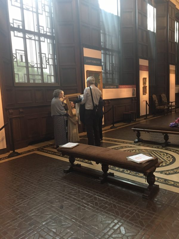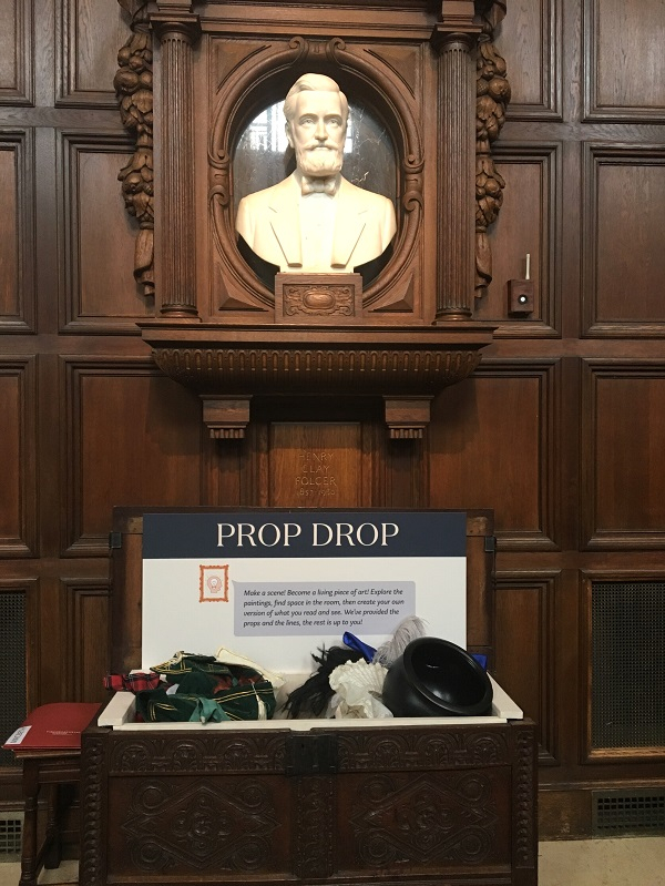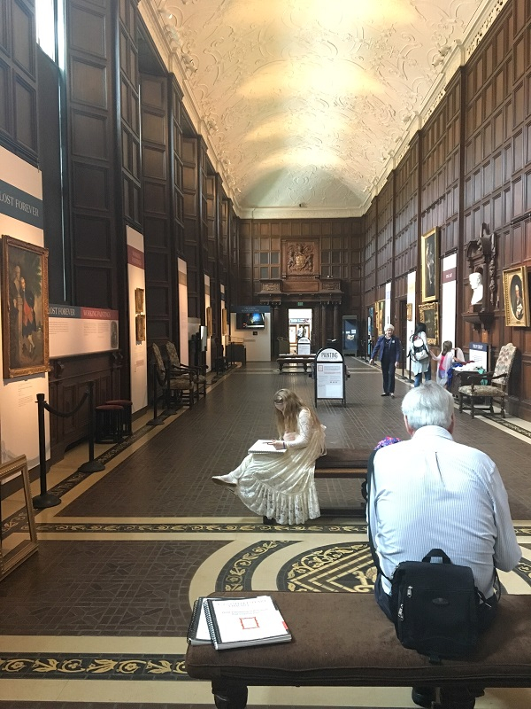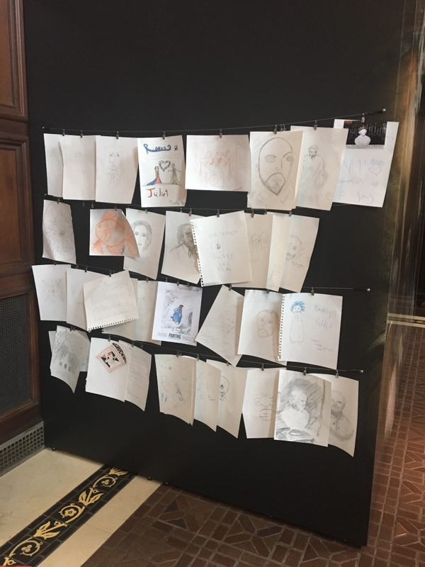 此外,长廊还有三处游客互动参与处,可以分别跟莎士比亚的大理石雕像进行合照,着莎士比亚戏剧服装拍照以及动手再描绘你心中的莎士比亚,最重要的是还可以在社交网络分享你的图片!当时是周三下午四点左右,整个长廊并没有什么游客。除了我之外,一位年长的讲解员正热火地陪着一对老夫妻带着他们的孙女举着画框跟莎士比亚的雕像拍照,之后他们又转移去戏服角进行角色扮演的拍照,最后小姑娘才安静下来有模有样地开始画画。也正是这个时候,那位讲解员才过来跟我搭讪。