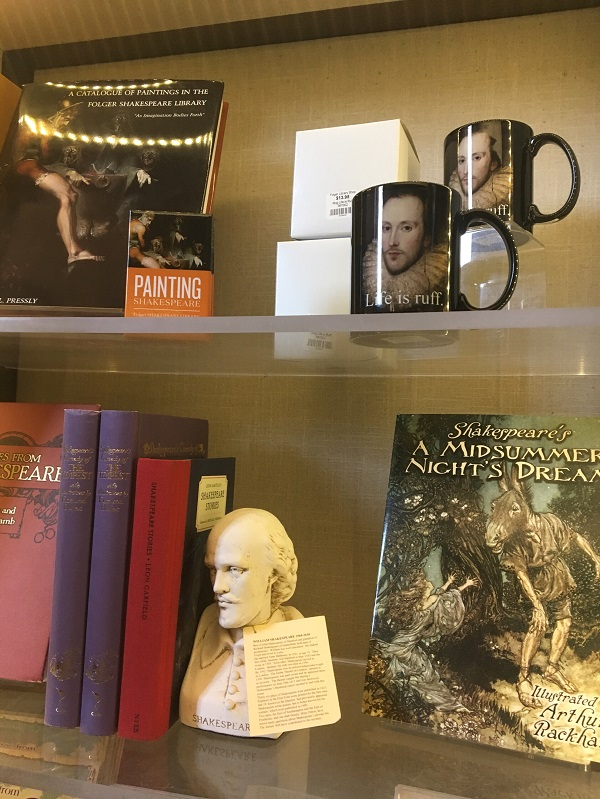 与鲜明的海报相比,莎士比亚图书馆的入口则显得过于低调,不知道有多少人跟我一样竟差点错过。推开两扇沉重的玻璃大门,一股强烈的冷气扑面而来。出人意料的是门口竟然不用安检,估计是游客太少的缘故吧。前台着保安制服的非裔美国人妇女看见有人进来立即迎上来介绍说,只有左侧长廊和右侧纪念品商店可以参观,而前方的阅览室则请留步。去过这么多图书馆,不让进去看眼书,除了不开架的国会图书馆外,这还是头一次,更别提进去参观下阅览室咯。