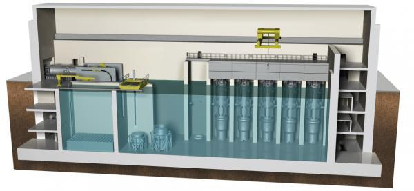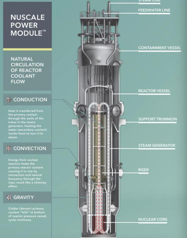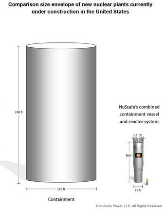 每个NuScale模块(圆柱密封模块中包含反应堆和蒸汽发生器)约76英尺高(约合23米)、15英尺宽(约合4.6米),这一设计使其能够方便地以船舶、卡车或火车装运。虽然是传统轻水反应堆的精简版,但这种SMRs具有全新的、优良的安全特性。由于反应堆和安全壳都被置于位于地下的水池中,水作为冷却介质,反应堆在自然循环下运行。它还有一套非能动安全系统,即使在持续性失电情况下(比如福岛核事故中因海啸引发的失电),也能够自动关闭反应堆或是在没有人为干预的情况下冷却反应堆。