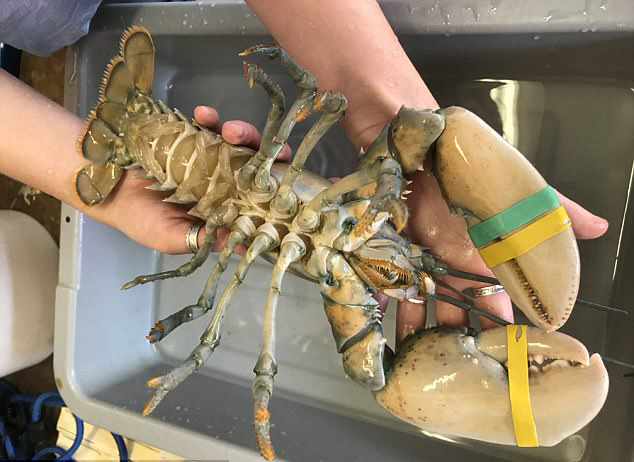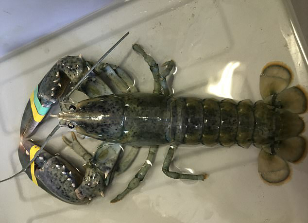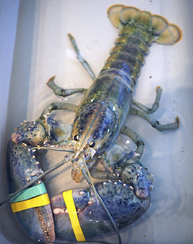 当地时间7月17日,当地捕虾人格雷格•沃德(Greg Ward)在两州交界处的海岸上捕获到了这只蓝色龙虾。起初在检查战利品时,沃德认为自己捕获的这只蓝色龙虾患有白化病。但随后这位有着32年丰富捕鱼经验的渔民很快就发现,这只硬壳龙虾还呈现出独特的蓝色和淡黄色。龙虾中仅有1亿分之一的概率会出现白化病品种,而仅有3000万分之一的概率会出现蓝色和橙色相间的斑点龙虾。
