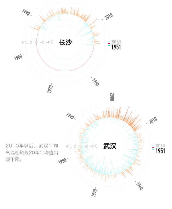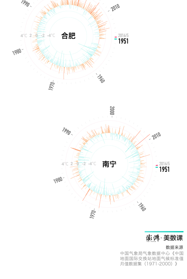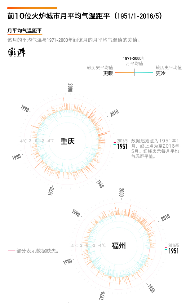 为了进一步了解新火炉城市是怎么诞生的,澎湃新闻还整理了1980年1月到2016年5月每月平均气温距平值,即该月的平均气温与1971年至2000年间该月的月平均气温值之间的差值,负值为偏冷,正值为偏暖。